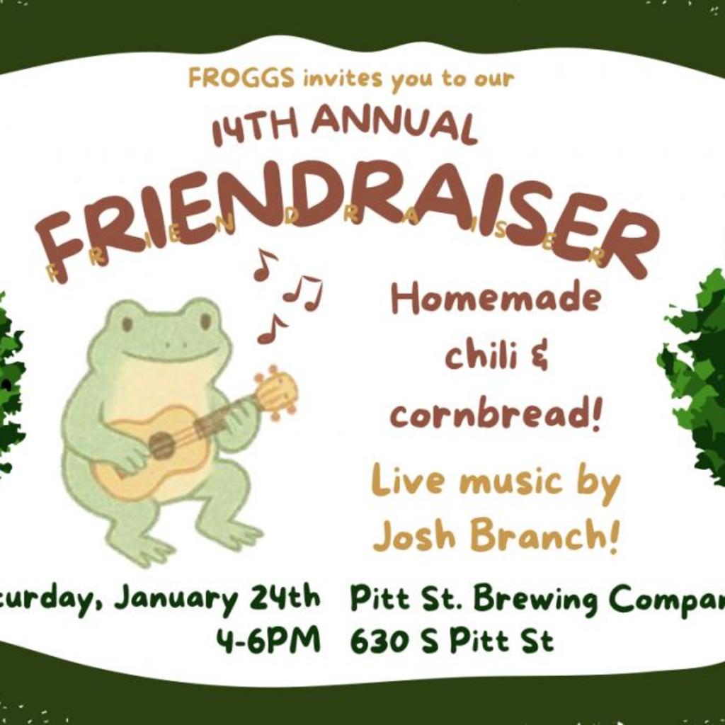 Join us for the 14th Annual FROGGS Friendraiser!Come out on Saturday, January 24th from 4–6PM at Pitt Street Brewing for an evening of community and fun.????? Enjoy homemade chili and cornbread???? Live music by Josh Branch???? Learn how to get involved with FROGGS—or just come make some new friends (and bring a few along, too!)We can’t wait to see you there!
