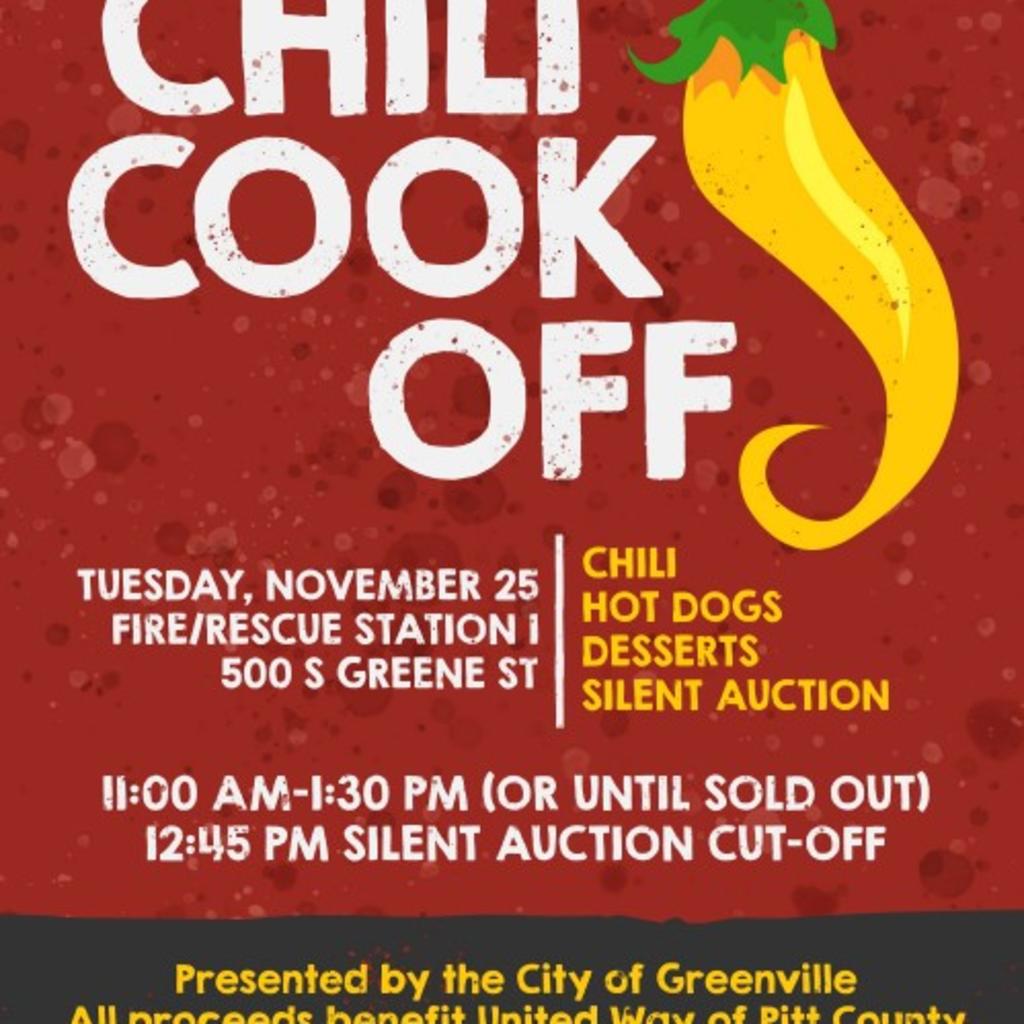 Come out to the City of Greenville, NC's Annual Chili Cook-Off Fundraiser on November 25th from 11:00 a.m. - 1:30 p.m. at Fire/Rescue Station 1 (500 S Greene St). Stop in and get some delicious homemade chili, hot dogs, and desserts and help us determine who has the best chili recipe around town! Presented by the City of Greenville. All proceeds benefit United Way of Pitt County