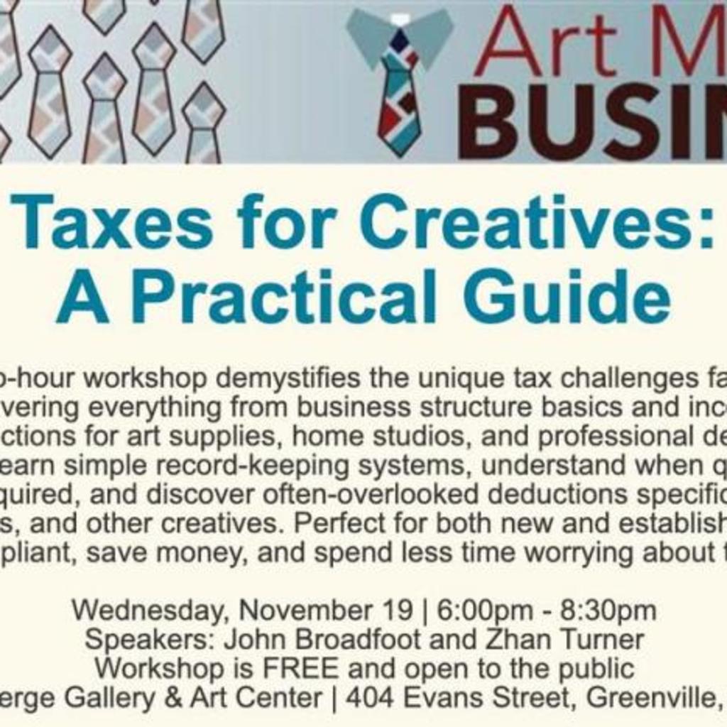 This practical two-hour workshop demystifies the unique tax challenges facing creative professionals, covering everything from business structure basics and income tracking to maximizing deductions for art supplies, home studios, and professional development. Participants will learn simple record-keeping systems, understand when quarterly payments are required, and discover often-overlooked deductions specific to artists, writers, musicians, and other creatives. Perfect for both new and established artists who want to stay compliant, save money, and spend less time worrying about taxes.Date: November 19, 2025Time: 6:00 - 8:30pmLocation: Emerge Gallery & Art Center; 404 Evans St. GreenvilleSpeaker: John Broadfoot and Zhan Turner