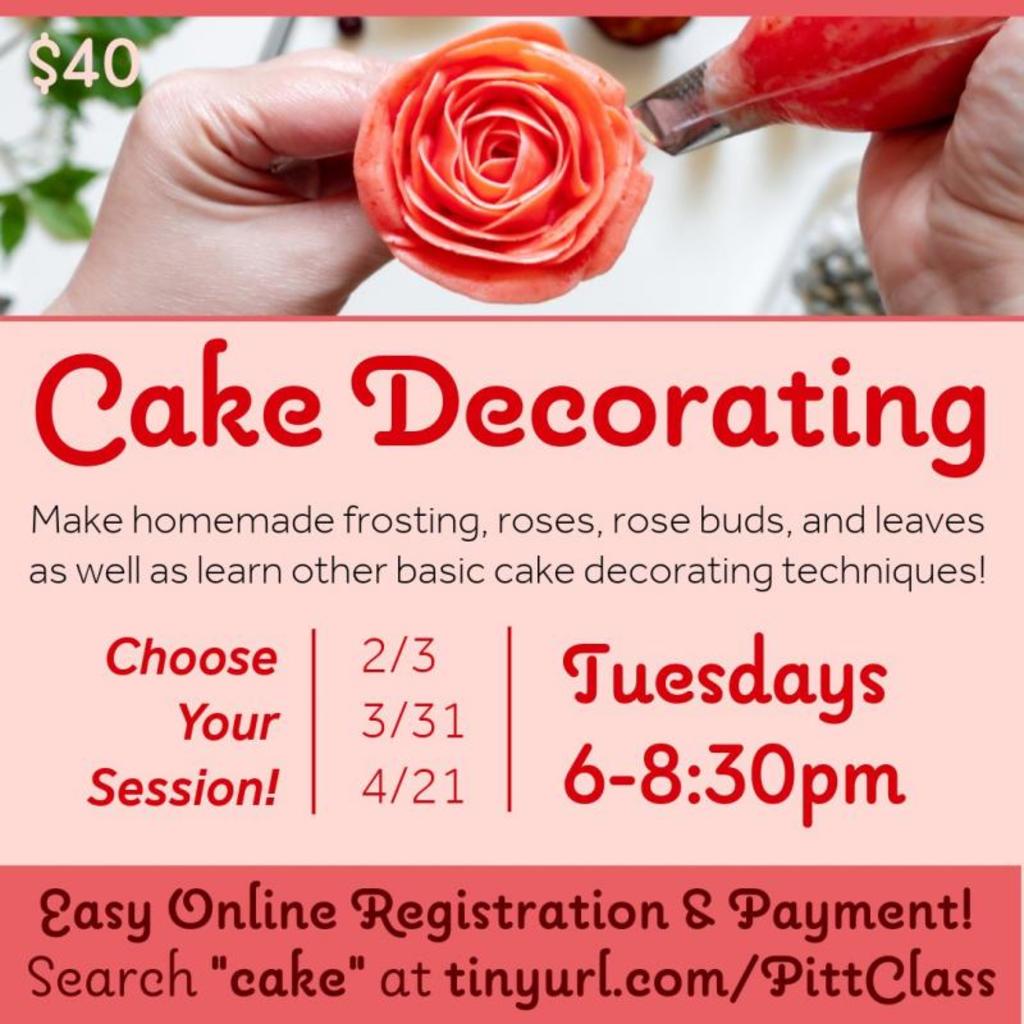 Ready to transform your cakes into edible masterpieces? Learn to whip up homemade frosting, stunning roses, cute rosebuds, and perfect leaves! We'll cover all the basic cake decorating techniques you need to impress everyone.All this sweet fun for just $40!Easy online registration & payment:Go to http://tinyurl.com/PittClass and search "cake"