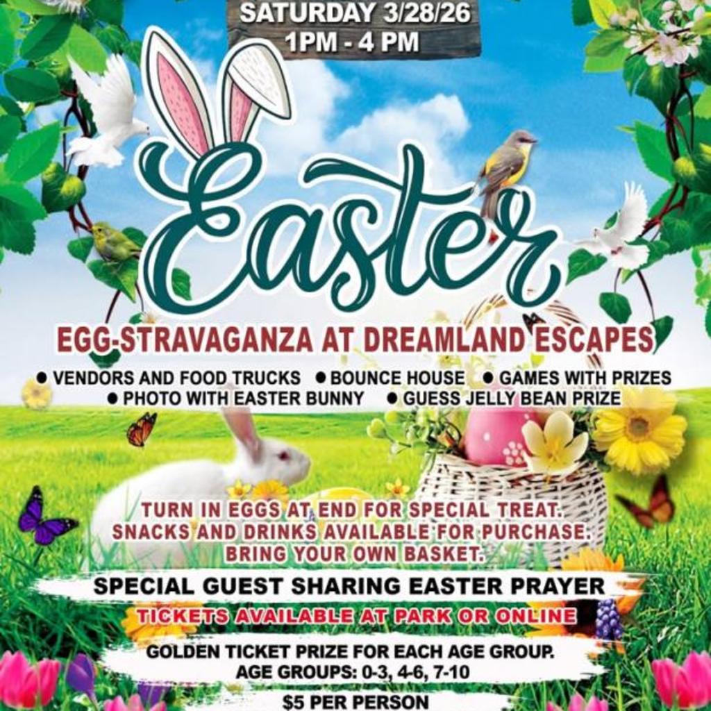 Join us for our 5th Annual Easter Egg Hunt!Admission is $5/personThis covers bounce house, games with prizes, egg hunt, photos with Easter Bunny (taken with your phone/camera), and goodie bag for each child.We have 3 different hunts, 1 for each age group.There will be a lucky ticket drawn for each group for a chance to win a grand prize!Guess the jelly beans and win a prize!!Lots of fun! Lots of prizes!There will be food available for purchase and vendors!!Come join us!Tickets can be bought online at www.dreamlandescapesnc.net or they can be bought at gate!We take cash and card.Hope to see you there!!