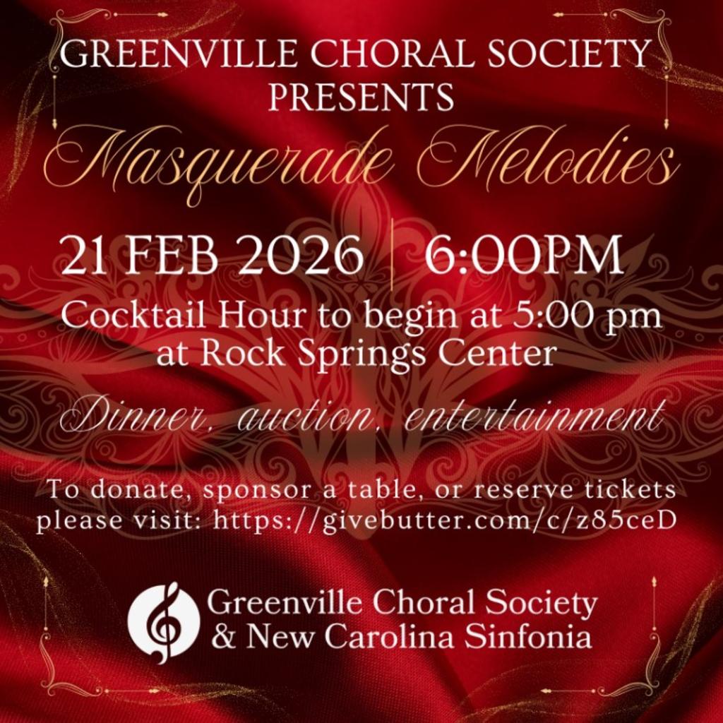 Join us February 21, 2026 for Greenville Choral Society’s annual Gala! This year’s Masquerade Melodies (with masquerade masks encouraged, of course ????) will be one you won’t want to miss! With dinner, an auction, and entertainment provided by the GCS Concert Choir, we are looking forward to a wonderful night.Tickets available here: https://givebutter.com/c/z85ceDThe deadline to purchase tickets is FEBRUARY 12, so don’t delay
