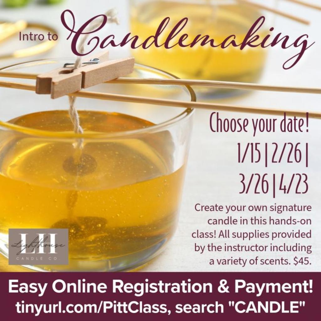 Get ready to light up your life! Our DIY candle-making class is the ultimate scent-sational experience. You'll handcraft your very own custom candle, picking every aroma to make it uniquely yours. It's the perfect treat for yourself or a thoughtful gift for someone special! All materials provided – just bring your creativity! Only $45 to unleash your inner chandler!EASY ONLINE REGISTRATION & PAYMENT!Search "CANDLE" at http://tinyurl.com/PittClassFor more information call 252-493-7317