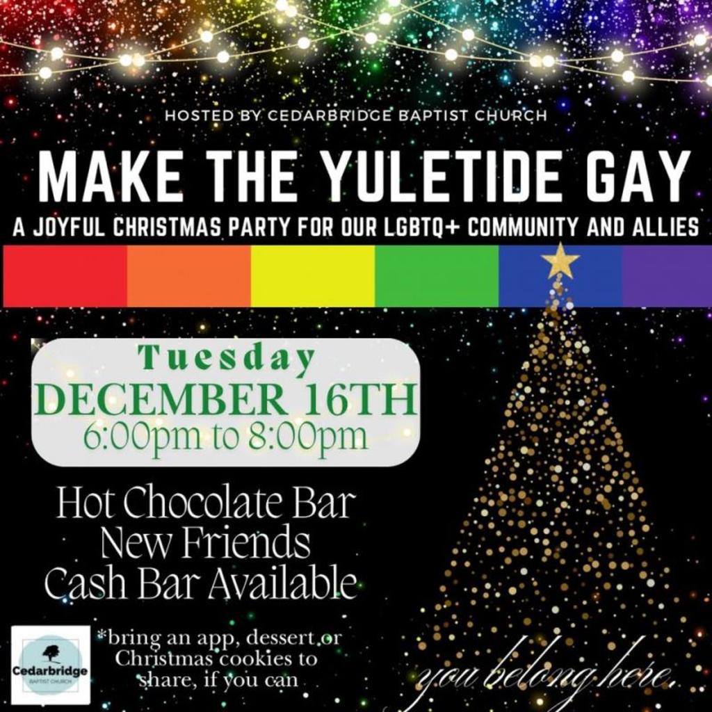 Dear friends,We understand that the holidays can be a challenging time for many, especially within the LGBTQ+ community. We are really great at welcoming and creating an inclusive space where everyone can feel celebrated and loved on the regular but we wanted to do something special this Christmas.Come enjoy a delicious hot chocolate bar, and a cash bar for adult beverages, if that’s your jam. Your presence is what truly matters, but if you'd like, feel free to bring an appetizer or desert to share!Let’s come together, “Don we now our gay apparel” or in whatever you feel like that day, and let’s celebrate the Christmas spirit with love and sparkles. This is a time to be yourself, embrace the joy of the season, and connect with a community that cares for you.Happy Holidays,Cedarbridge Baptist Church