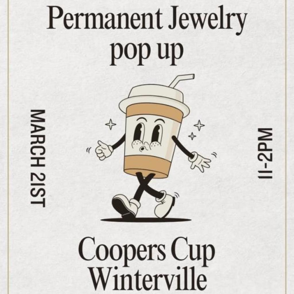 1 of 1 MARCH Permanent Jewelry @ Coopers Cup Location Coopers Cup Address 2588 Railroad Street, Winterville, NC 28590 Phone 2526891454 Email Website About Presented By Coopers Cup Dates March 21, 2026 Time 11:00 AM to 2:00 PM Need a need a new bracelet? Come get linked up!Permanent Jewelry with Eternally Connected!$20 bracelets Map