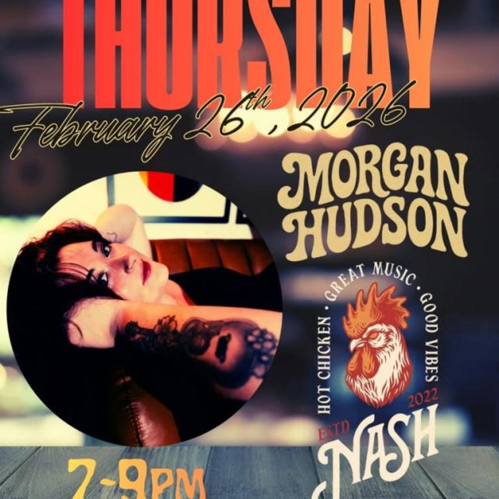 1 of 1 Morgan Hudson at NASH Hot Chicken *solo acoustic* Location Nash Hot Chicken Address 114 East 5th Street, Greenville, NC 27858 Phone 2529995444 Email Website About Presented By Nash Hot Chicken Dates February 26, 2026 Time 7:00 PM to 9:00 PM WING NIGHT Ft. Morgan Hudson acoustic set!Enjoy amazing chicken, cold beer, cool bartenders, and awesome vibes Map