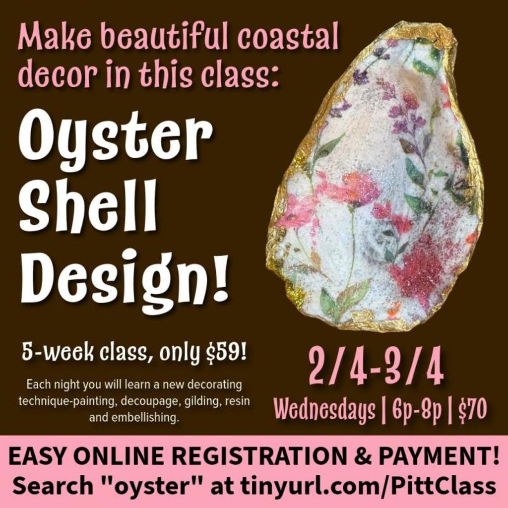 Turn ordinary shells into extraordinary coastal treasures in this 5-week workshop! Each night is dedicated to a new skill—you'll master painting, decoupage, gilding, resin, and embellishing to create beautiful, unique decor pieces. Perfect for bringing the beach indoors!2/4 - 3/4 | Wednesdays, 6:00 PM - 8:00 PM | $59Limited spots available! Sign up today and get ready to create stunning coastal art.EASY ONLINE REGISTRATION AND PAYMENT!https://pittcc-register.fundfive.com/course/section/27183