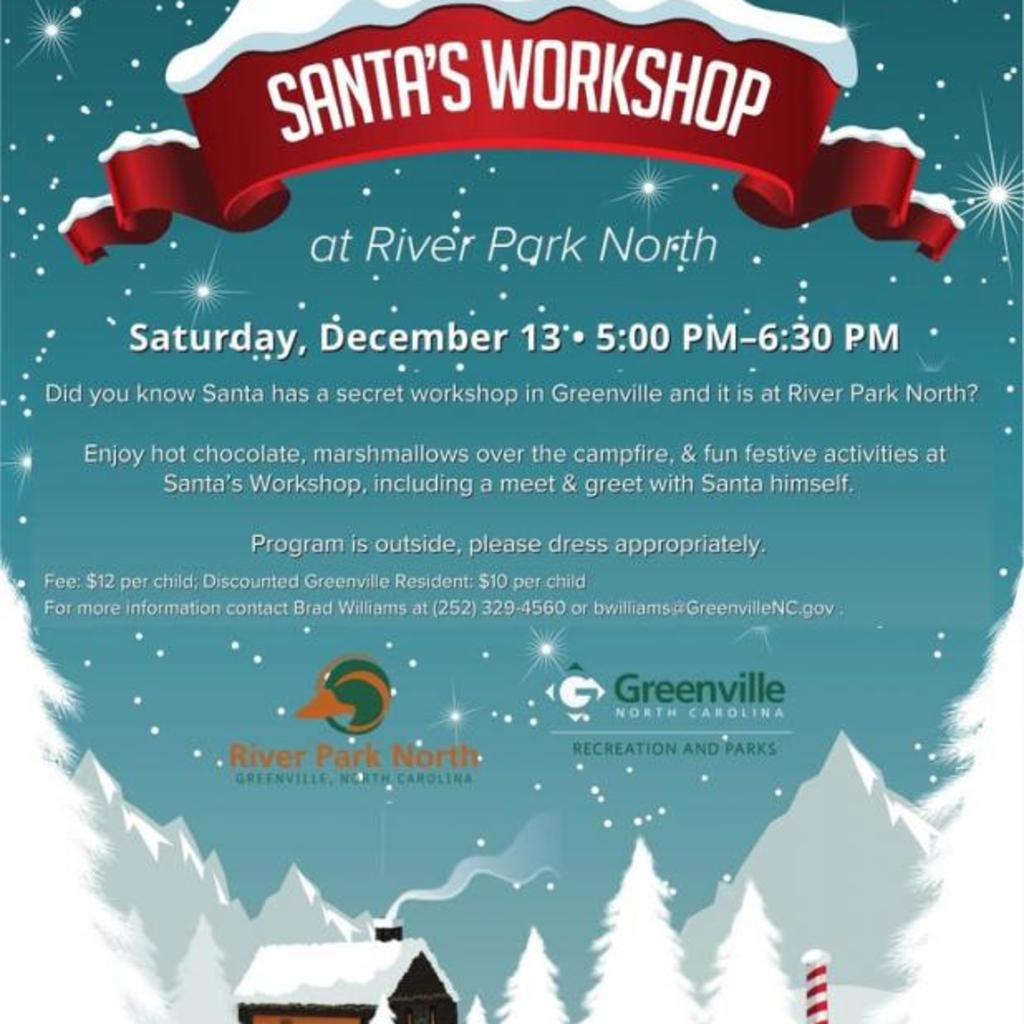 Did you know Santa has a secret workshop in Greenville and it is at River Park North? Enjoy hot chocolate, marshmallows over the campfire, and fun festive activities at Santa’s Workshop, including a meet and greet with Santa himself. Program is outside, dress appropriately. Open to all ages with adult. Fees are paid at front of Nature Center on day of program.Saturday December 13 5:00 PM – 6:30 PMFee: $12 per child; Discounted Greenville Resident: $10 per childFor additional information please call (252) 329-4560 or email bwilliams@greenvillenc.gov