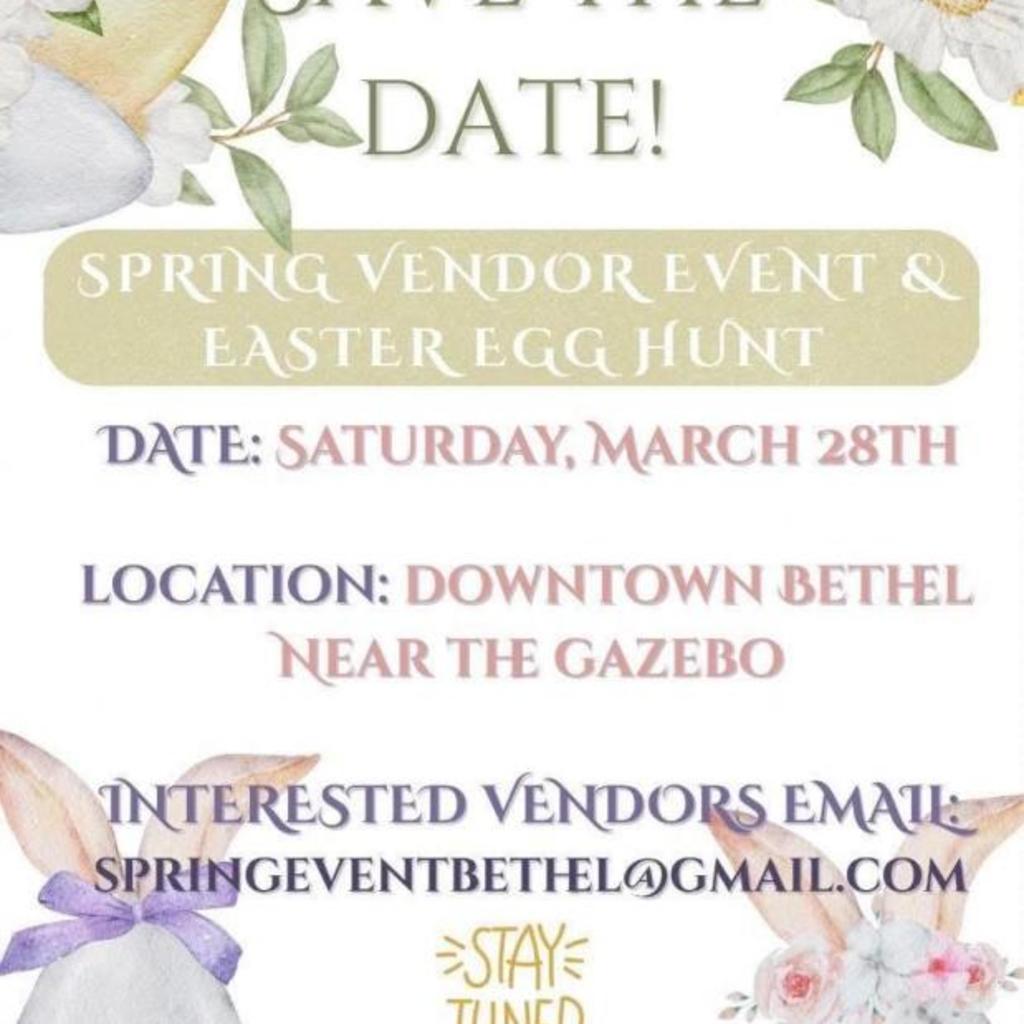 1 of 1 Spring Vendor Event and Easter Egg Hunt Location Downtown Bethel Address Bethel, NC 27812 Email About Presented By Downtown Bethel Dates March 28, 2026 Time 10:00 AM to 2:00 PM Save the date for the Spring Vendor Event and Easter Egg Hunt at Downtown Bethel near the gazebo! Interested vendors email springeventbethel@gmail.com. Map