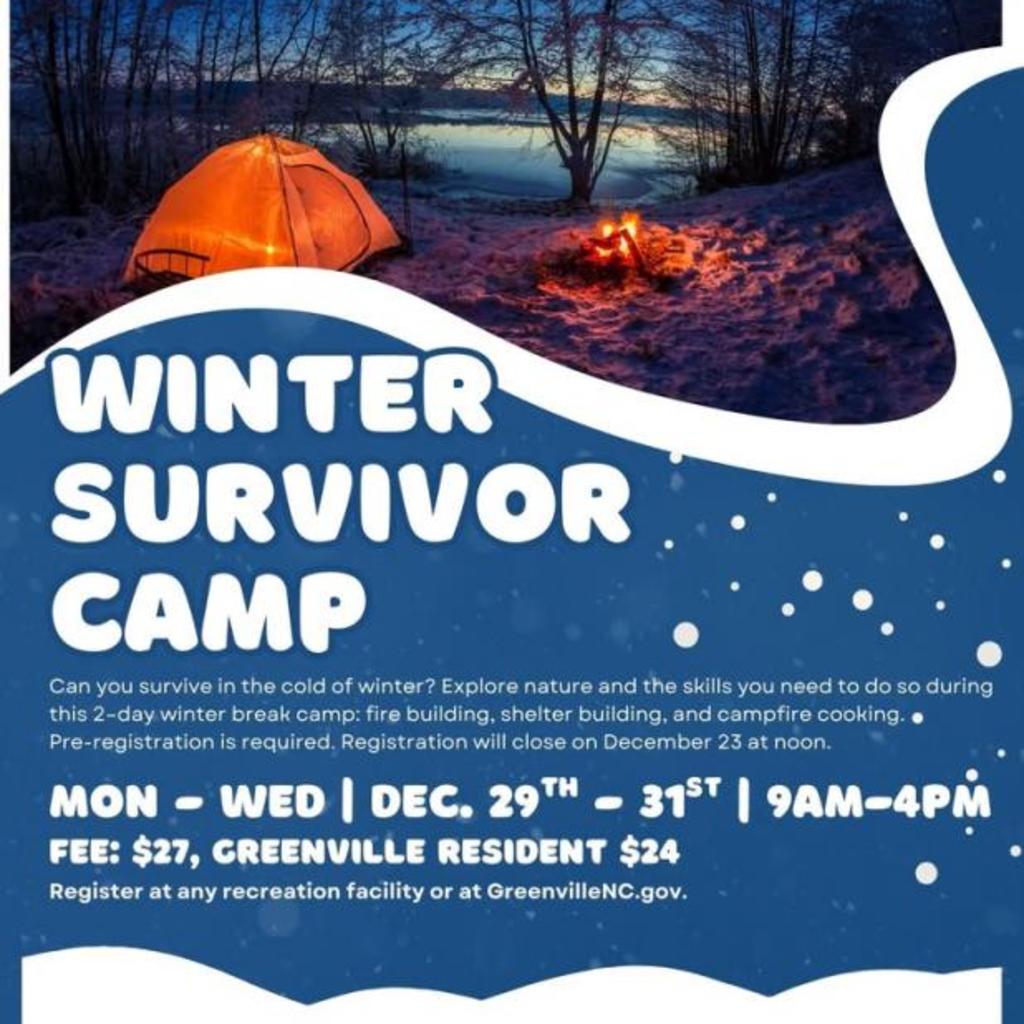 Can you survive in the cold of winter? Explore nature and the skills you need to do so during this 2–day winter break camp: fire building, shelter building, and campfire cooking. Pre-registration is required. Registration will close on December 23 at noon. For ages 8 - 12.351003.02 Monday-Wednesday December 29 – December 31 9:00 AM–4:00 PMMaximum Number of Participants is 12.Fee: $27; Discounted Greenville Resident: $24.Register at any GRPD facility or online at greenvillenc.govFor additional information please call (252) 329-4560 or email awimsatt@greenvillenc.gov