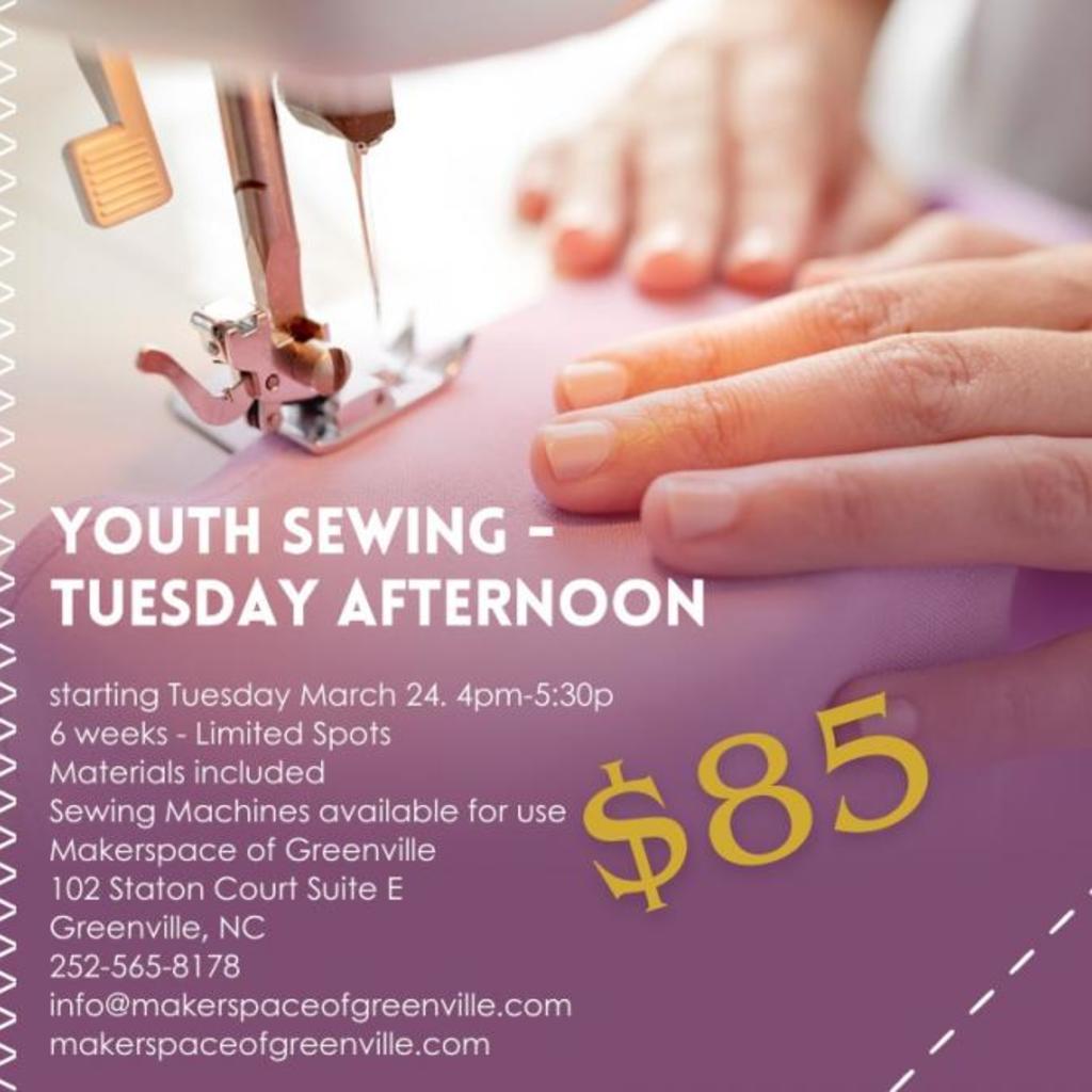 Youth Sewing – Tuesday Afternoon Class!We're excited to open registration for our upcoming Youth Sewing Program at the Makerspace of Greenville!Perfect for beginners and young creatives who want to learn sewing basics, build confidence, and make fun projects.Starts Tuesday, March 244:00pm–5:30pmMakerspace of Greenville$85 for 6 weeksAll materials includedSewing machines provided!Limited spots are available — reserve your seat today!252-565-8178info@makerspaceofgreenville.com